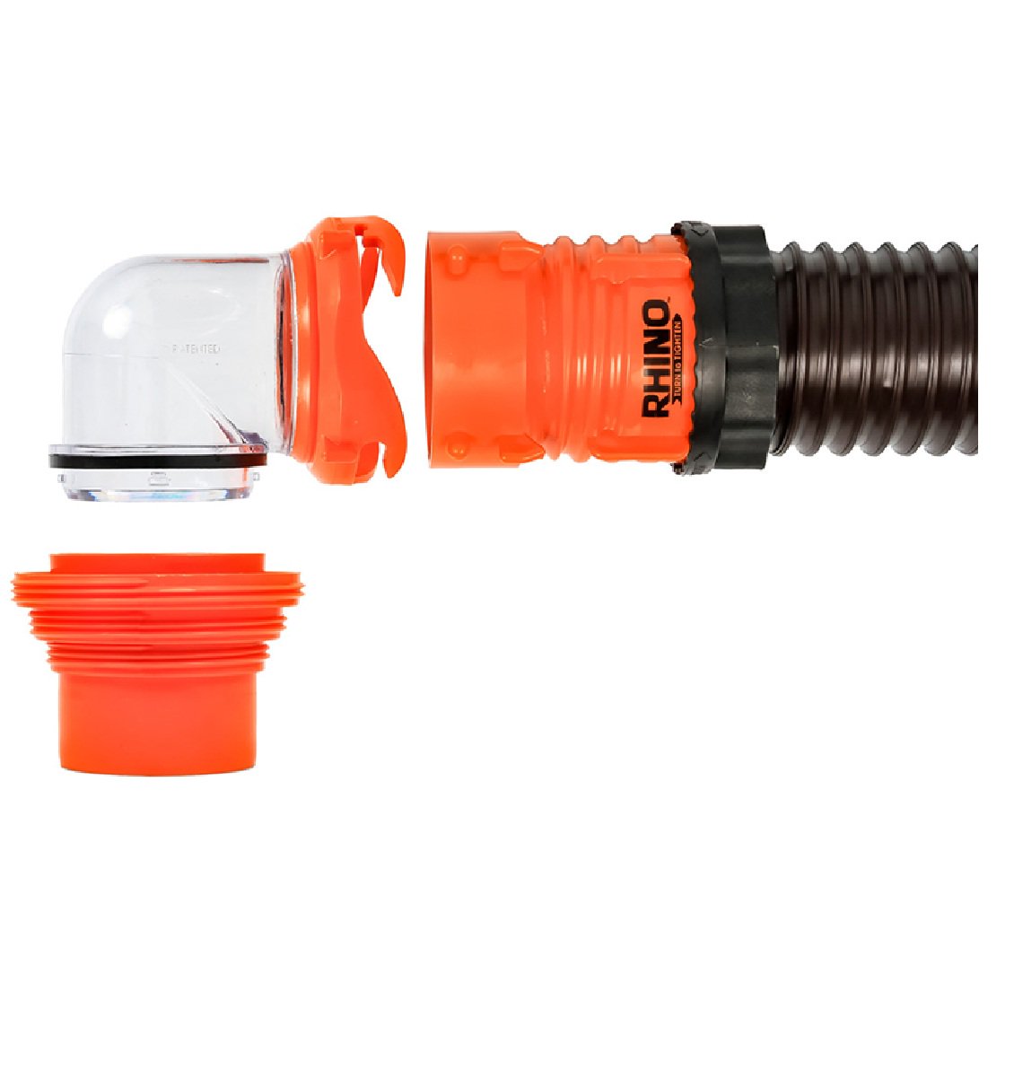 - Kit Includes: Two 10-inch RhinoFLEX sewer hoses with pre-attached bayonet and lug fittings, a transparent elbow with 4-in-1 adapter, and four storage caps