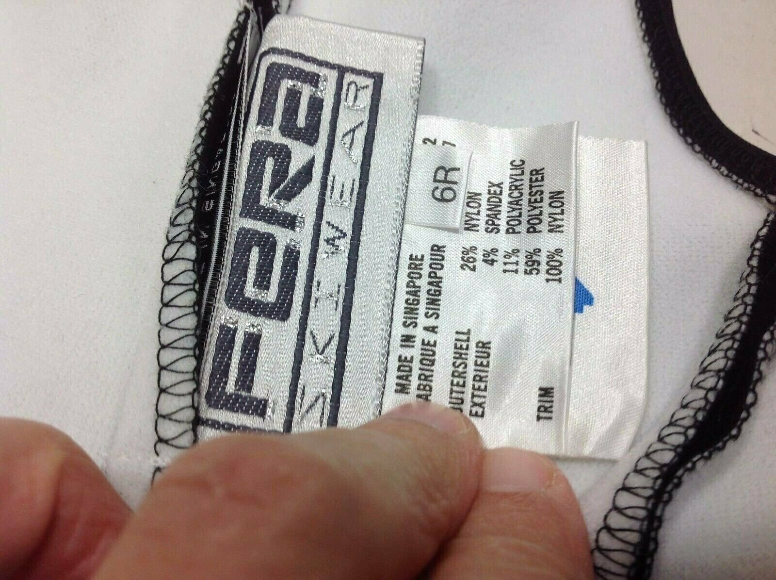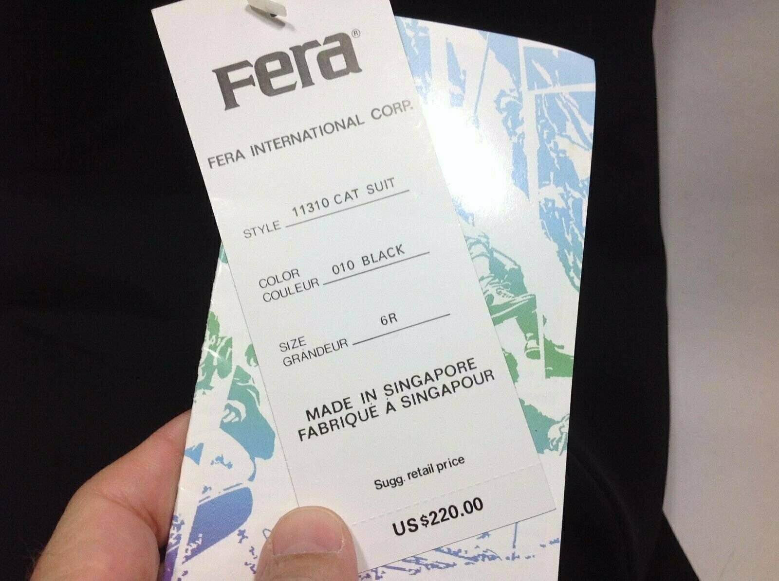 Fera Skiwear Cat suit Schoeller WB 400 Black Size 6R 1/4 zip front stirrupsa one-piece, unlined trouser with stirrups and shoulder straps.It hasa back bib and a low rise in the front with a zipperopening. Thefabric is a three layer trade-named fabric fromSwitzerland knownas WB400. It consists of a woven stretch outer materialthat is59% polyester, 26% polyamide, 11% polyacrylic and 4%spandex, aplastic film in the center and an inner knit fabric.style number 11310 cat suit$220
