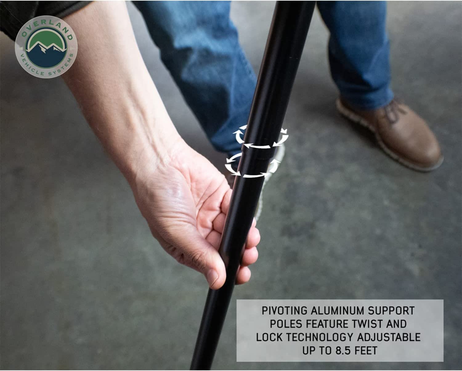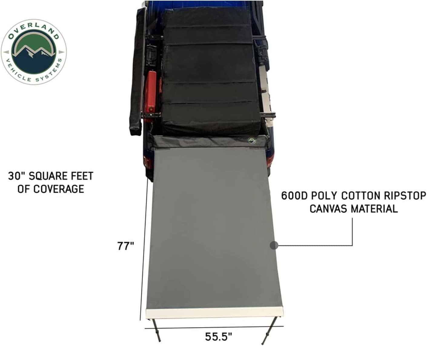 Enjoy a more nomadic lifestyle with the Overland Vehicle Systems 4.5 Foot Nomadic Roof Rack Vehicle 600D Awning providing instant shelter anywhere your vehicle can reach. This vehicle awning attaches to nearly any roof rack, factory or aftermarket. Its aluminum frame pulls out and features telescoping legs to drop down to the ground, ensuring a sturdy, stable frame. A tie down kit is included for additional stability. The roof rack shelter's awning is woven from rugged 600D poly cotton, providing 30 square feet of shade and a waterproof roof barrier that's perfect for stretching out in your sleeping bag or making a campsite meal. When not in use, the camping accessory stows in the included weatherproof travel cover until it's time to kick back and relax in the great outdoors once again. Give yourself the freedom to explore with the Overland Vehicle Systems 4.5 Foot Nomadic Roof Rack Vehicle 600D Awning.INSTANT SHELTER: Instantly create 30 square feet of shelter with this vehicle awning extensionWATERPROOF AWNING: 600D rip-stop polycotton with heat-sealed seams provides shade and keeps water outATTACHES TO ANY ROOF RACK: Attaches to most any factory or aftermarket roof-rack; Dimensions (L x W x H): 77 x 55 x 72 inches; Weight: 17.95 pounds; Manufacturer warranty: 3-year warrantySTURDY FRAME: 2 aluminum rafters and 2 telescoping aluminum legs provide an instant, durable frame; Includes a tie-down kit with 2 sets of shock cord and stakes to provide additional stabilityCOVER INCLUDED: Weatherproof travel cover keeps the awning safe when not in us