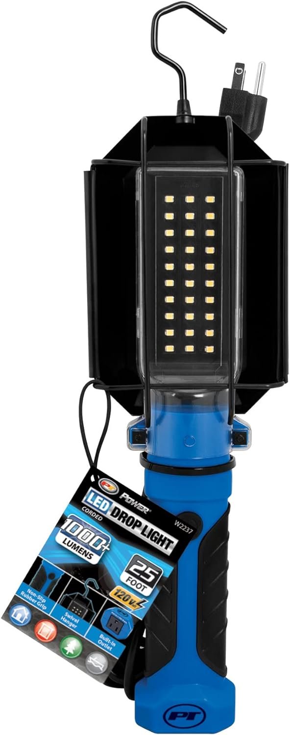 The Performance Tool W2237 Drop Light is the ultimate lighting solution for any tough work environment. Equipped with ultra-bright LED technology, this drop light produces over 1000 lumens of bright white light, providing optimal visibility for any task. The tough and durable design features an impact-resistant handle with a non-slip rubber grip, ensuring it can withstand even the harshest conditions. The powder-coated metal lamp shield provides added protection, while the swivel hang hook makes it easy to position the light exactly where you need it. Plus, with a 25ft grounded cord and built-in 120V outlet (500W MAX), this drop light provides the ultimate convenience for powering additional tools and equipment. Boasting a unique design that has been granted a US Patent D883560, the Performance Tool W2237 Drop Light stands out from the competition as a top-quality lighting solution.
